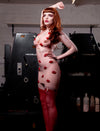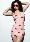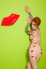 Latex high waist skirt with Red 3D latex lips with suspender grips.