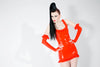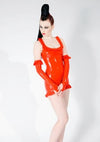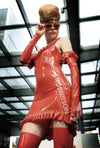 Red latex mini dress with ruffles.