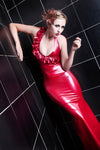 Halter neck floor length gown with ruffles.