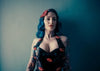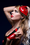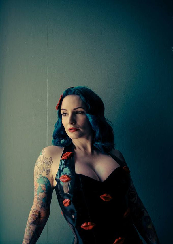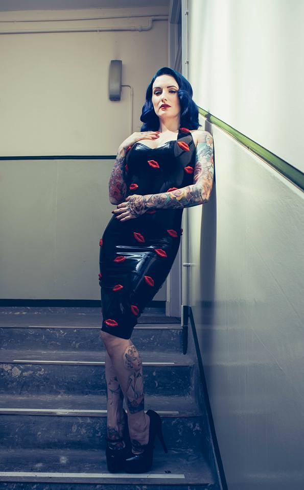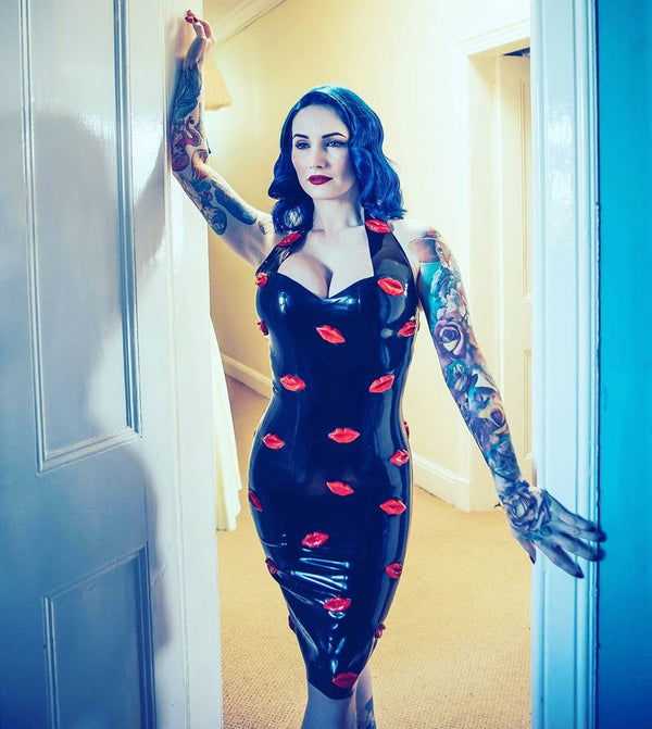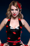 Black Pinup style halter neck dress with 3D latex lips all over.