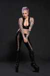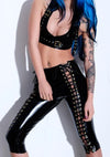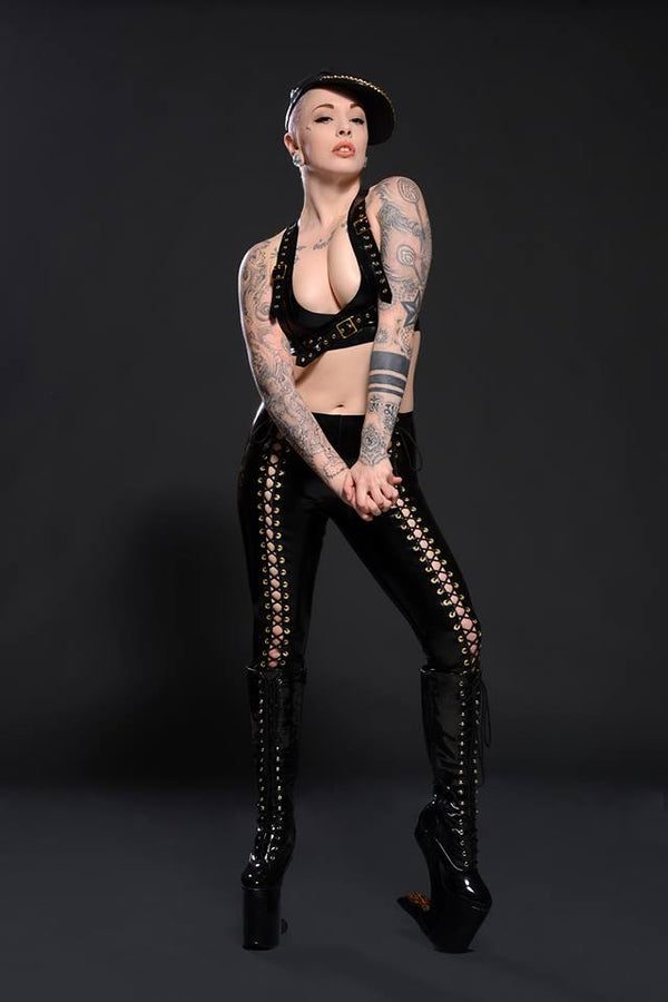 Knee length Lace up leggings with gold colour eyelets and lacing on front of the legs.