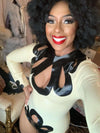 'Peacock' bodysuit in Black and White with cut out detail.