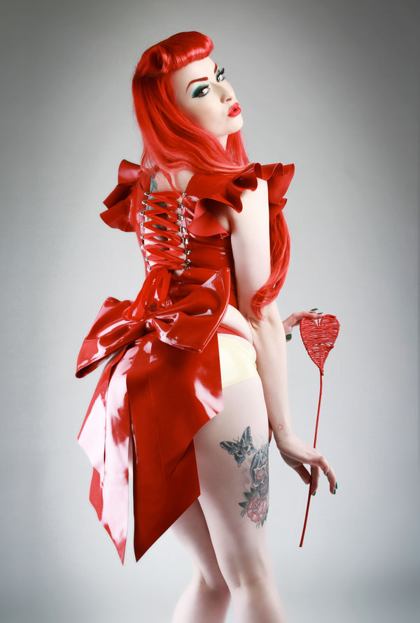 Shown in Red with white 3D latex hearts. Red velvet ribbon lacing
