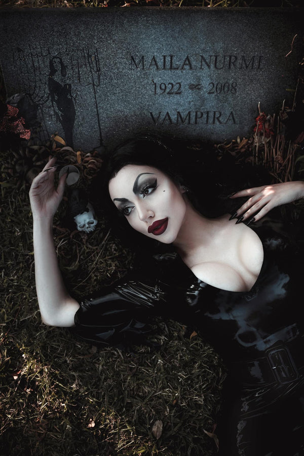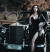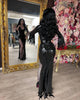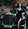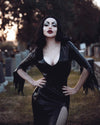 'Vampira' floor length dress in Black, with front slit and zig zag cut sleeve ends detail.
