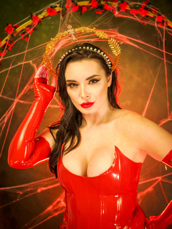 Red latex Corset top with pointy tips. Lace up at the back with silver or gold coloured eyelets with red lacing cord.